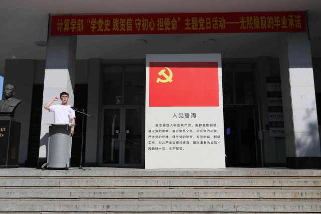 接着,毕业生党员代表高烁琳和新党员代表秦海滨先后发言,讲述了自己对于共产党人责任、使命和担当的认识,阐释了什么是哈工大人的忠诚报效,充分展示了哈工大计算学子昂扬进取的精神风貌,表达了对党的坚定信念和投身建设网络强国、制造强国、航天强国的决心。
