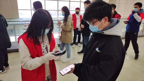 赵以诚负责测量体温、姚澜和梅艳婷负责扫码录入和用pos机扫描身份证信息、郭建健和刘胡超负责健康码行程卡查看以及现场排队引领,保持一米间距。除此之外,还有其他同志分别在不同的岗位上坚守。他们始终毫无半句怨言,而且为能够全程亲身参与全校核酸检测志愿服务工作而倍感荣光。谈到本次参加志愿服务活动时,党员梅艳婷说到:“我是一名党员,只要能为疫情防控做点事儿,再辛苦也值得。希望疫情早日结束,我们能出去看看春天”。